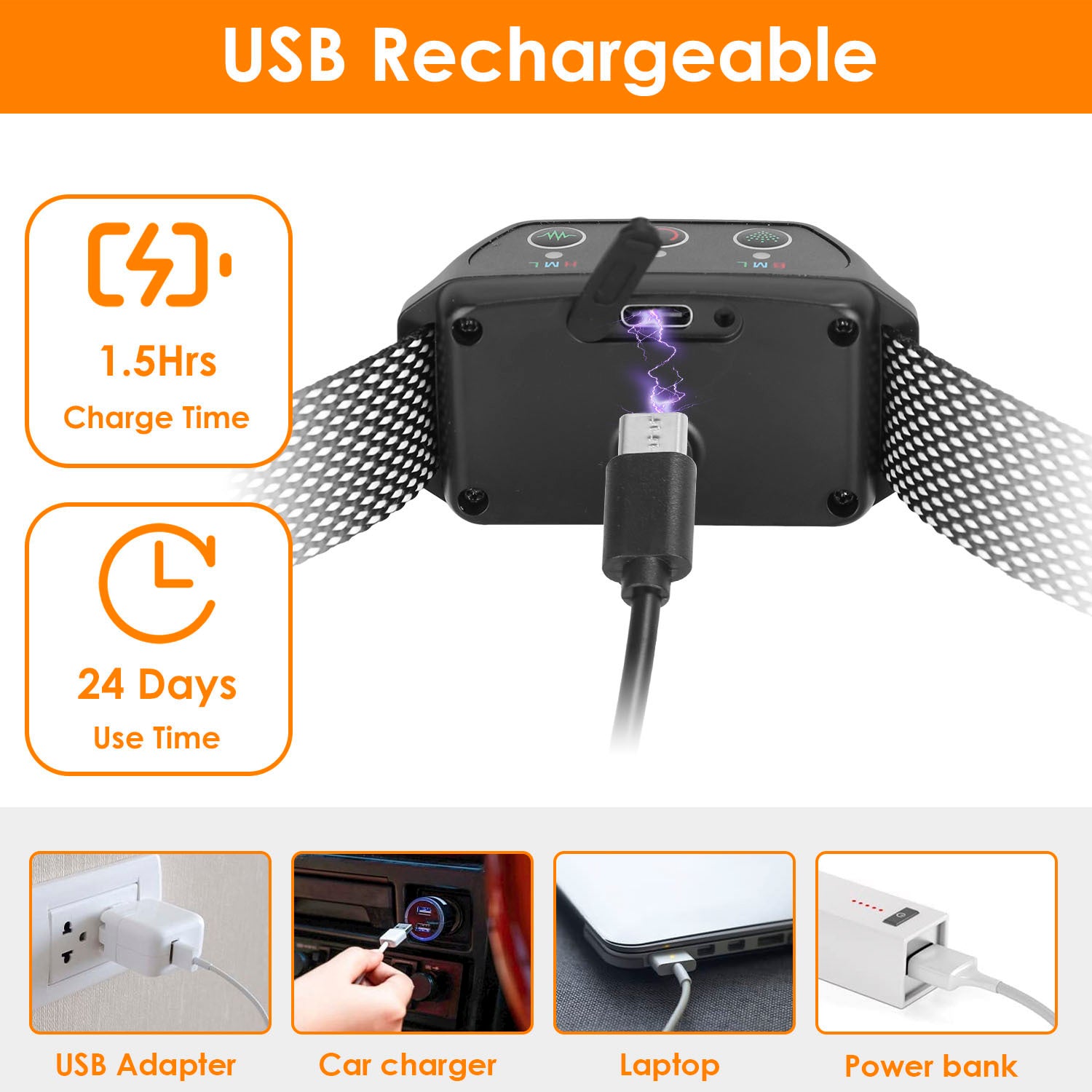 - *USB Rechargeable & Long-lasting Dog Collar*:  Featured with 120mAh rechargeable battery, the spray bark collar can keep standby for 24 days after 1.5 hour’s fast charging.