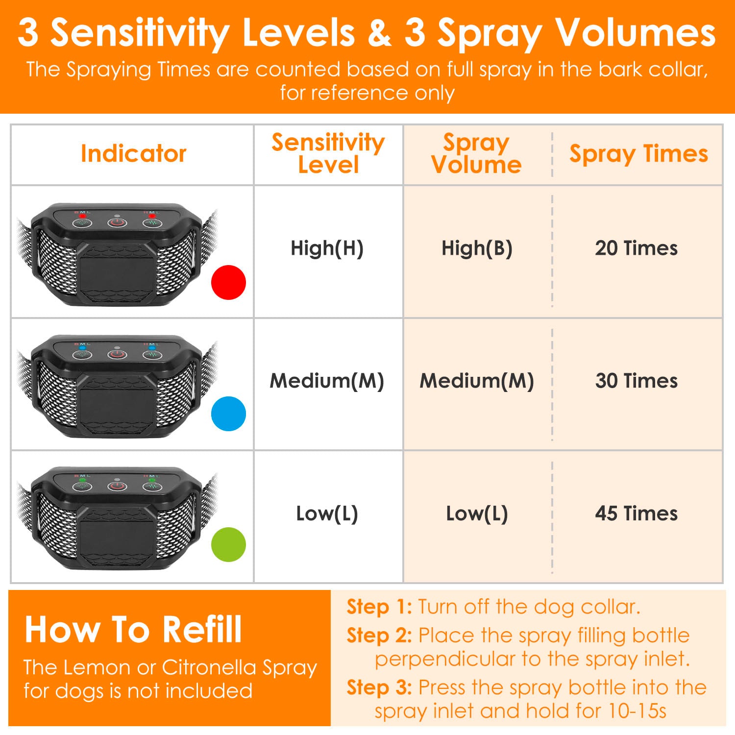 - *3 Sensitivity Levels & Spray Volumes*: Â This citronella bark collar features 3 sensitivity levels and 3 spray volumes, suitable for dogs of all sizes. You can choose the most suitable combination of sensitivity and spray volume for your furry friend.